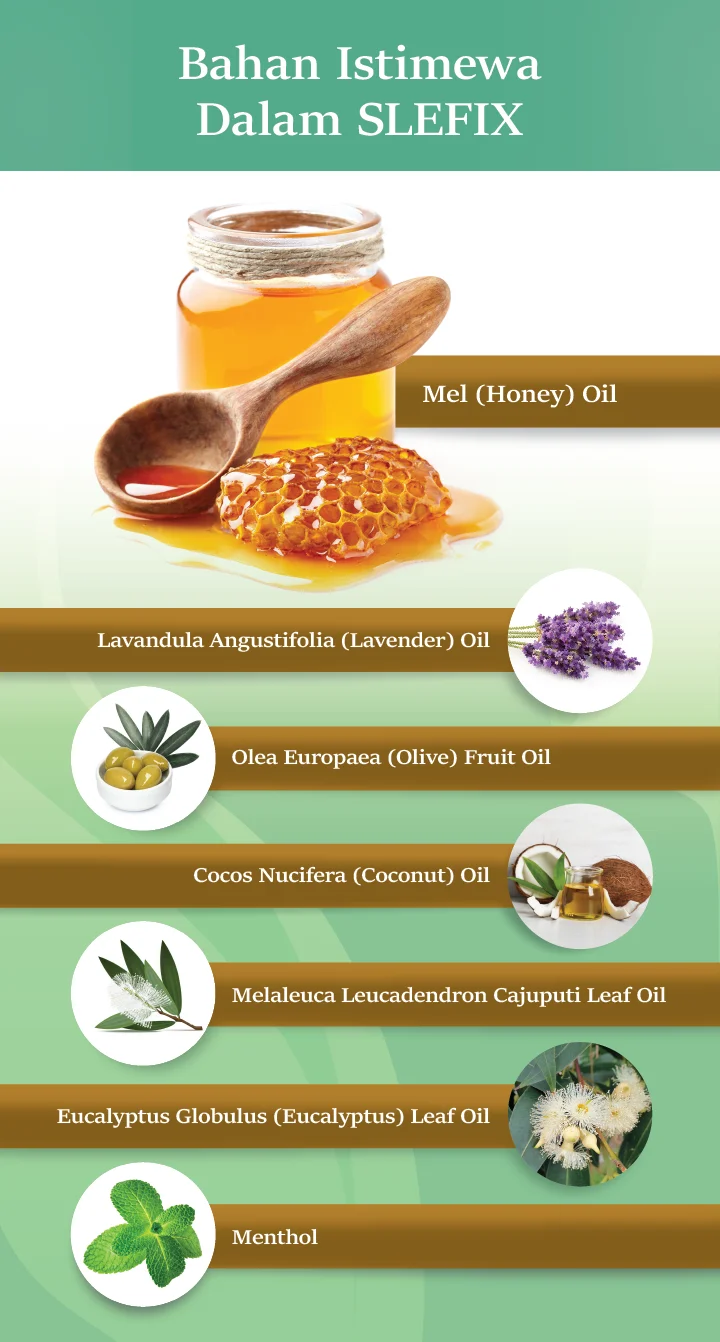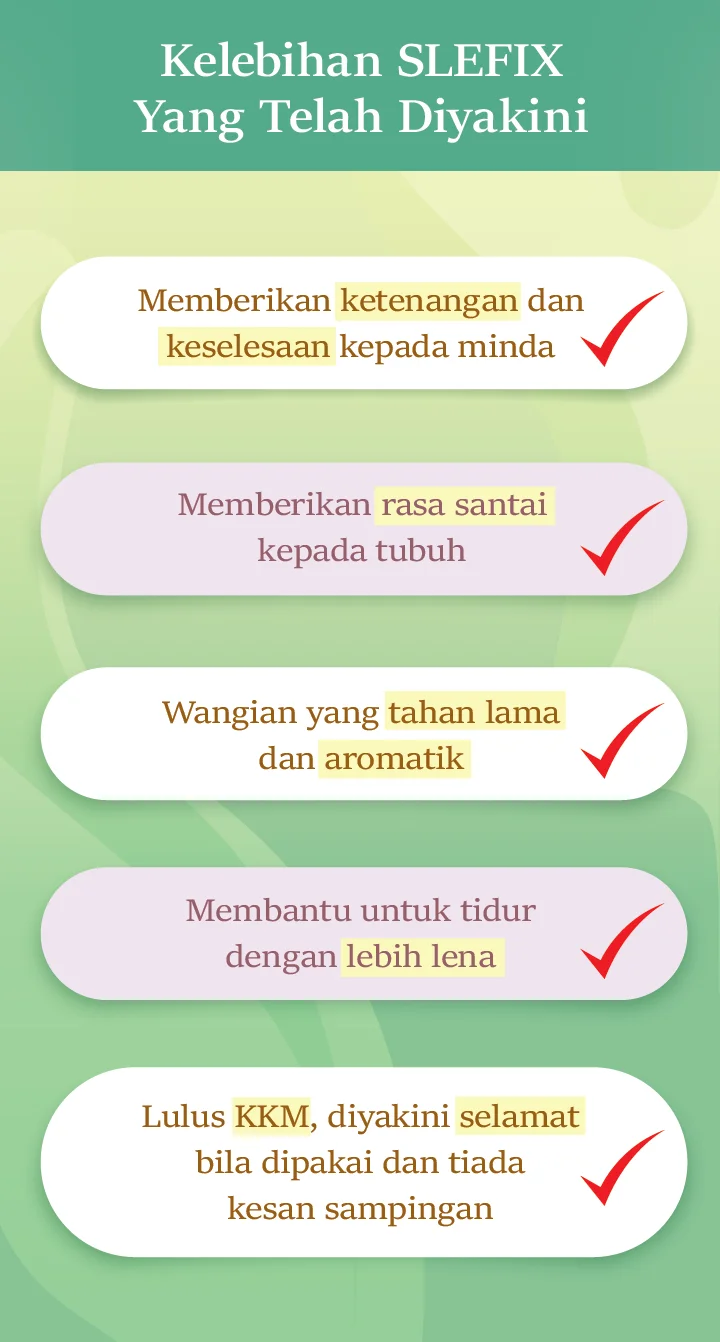 Salah satu bahan yang ada dalam SLEFIX ialah extrak lavendar. Bau haruman lavendar mampu memberi kerehatan pada minda.