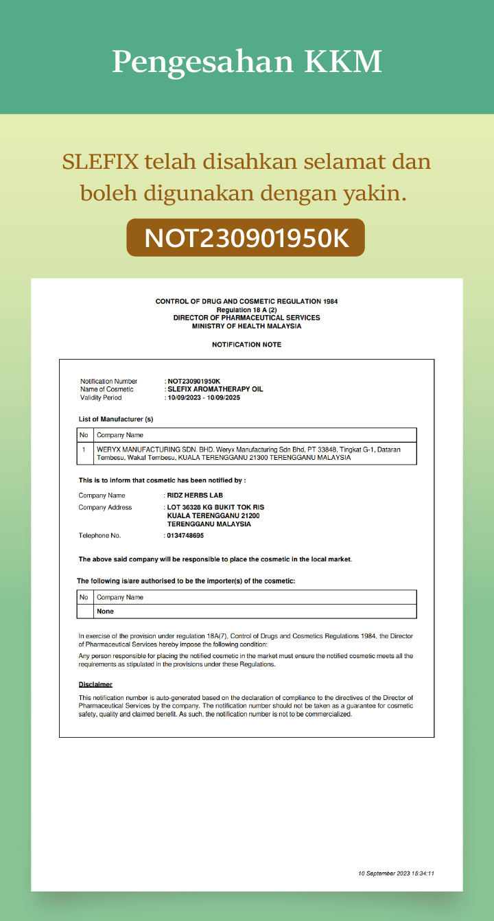 Saiz 1 unit Slefix+ ialah 24mm x 91mm, manakala isipadunya ialah 10ml.